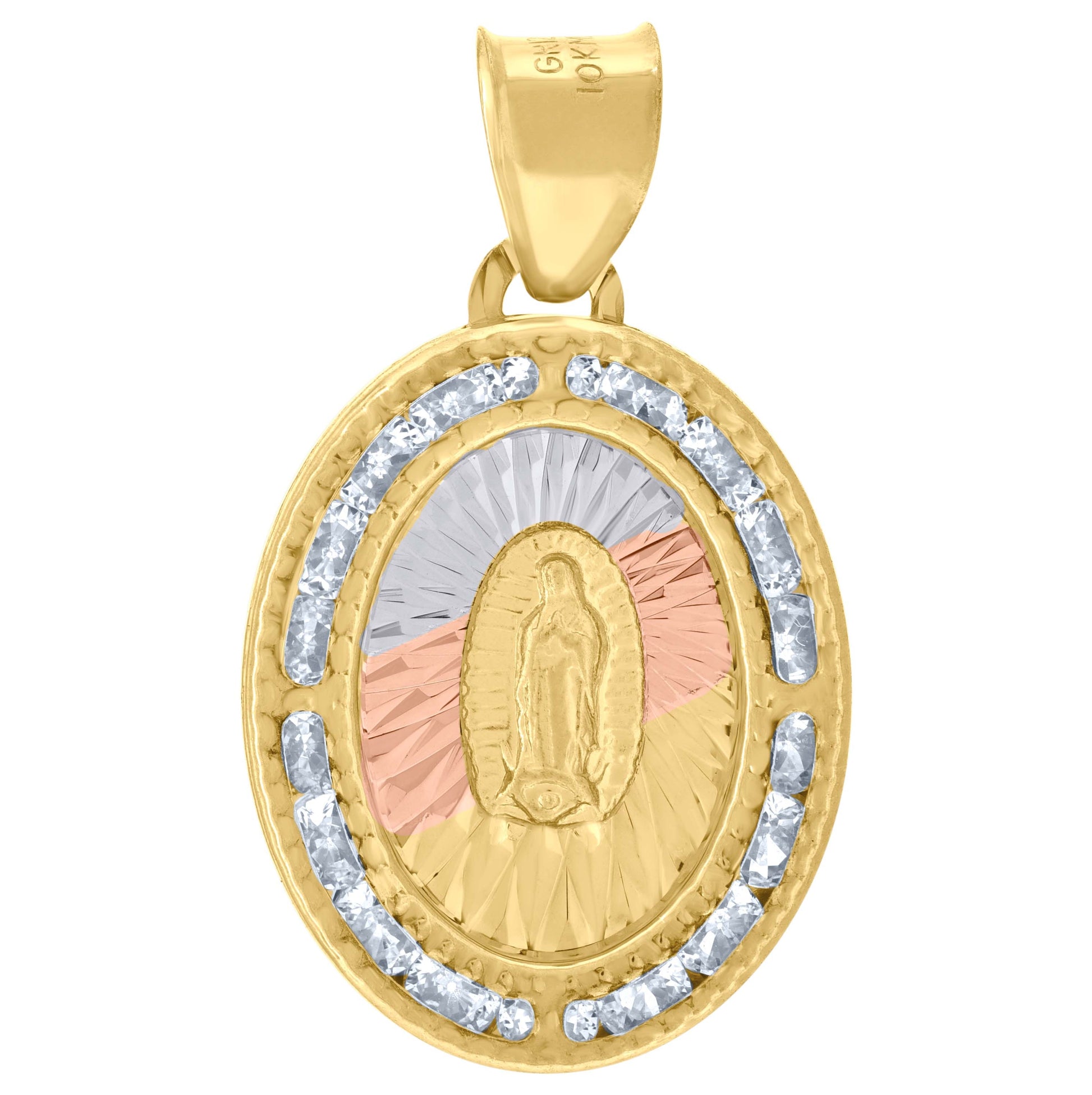 10K Tri-Color Gold Unisex Cubic-Zirconia Textured Lady Of Guadalupe Religious Oval Charm Pendant