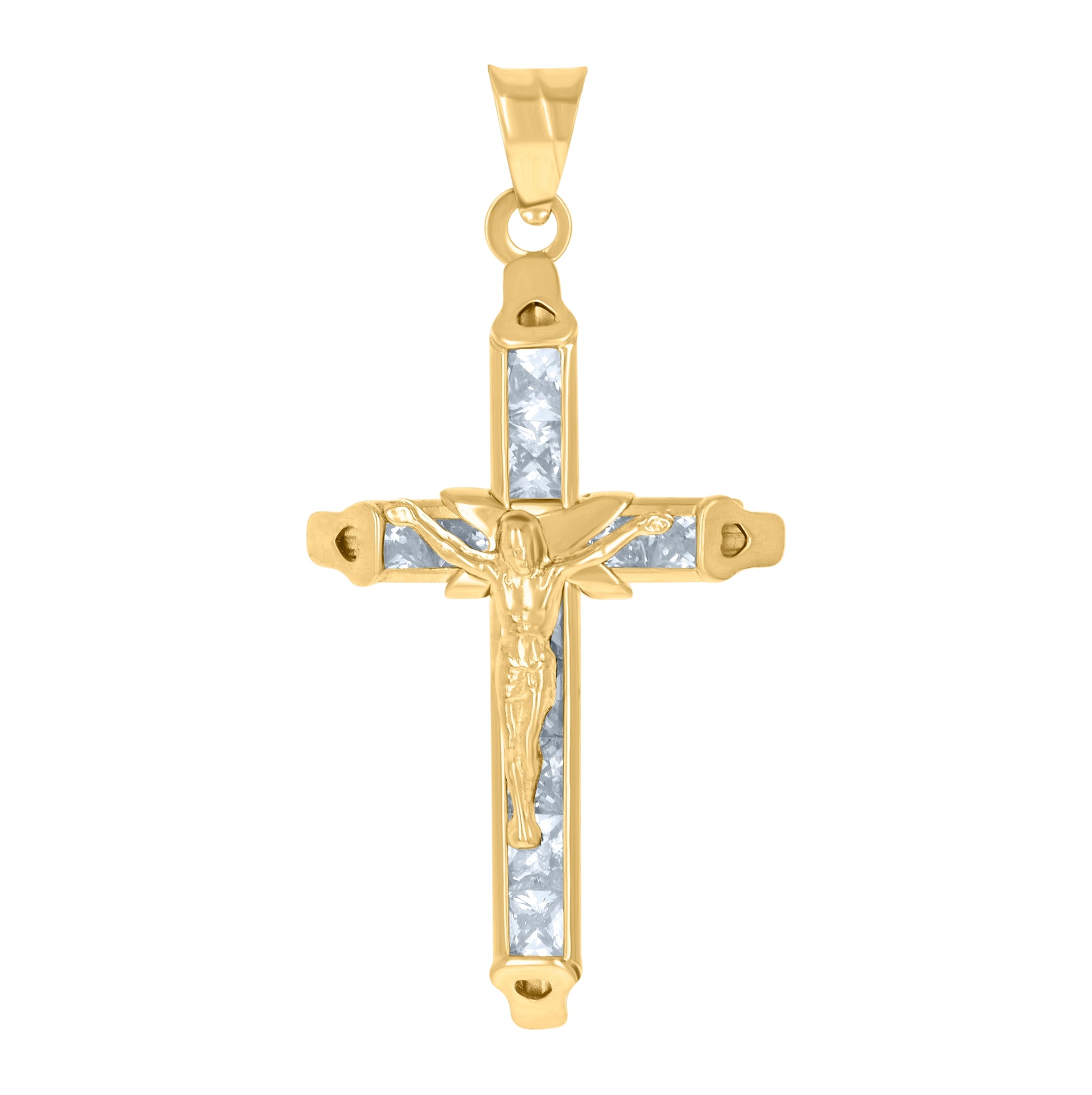 10K Yellow Gold Mens Women Princess Cut Cubic Zirconia Cubic-Zirconia Crucifix Cross Religious Charm Pendant
