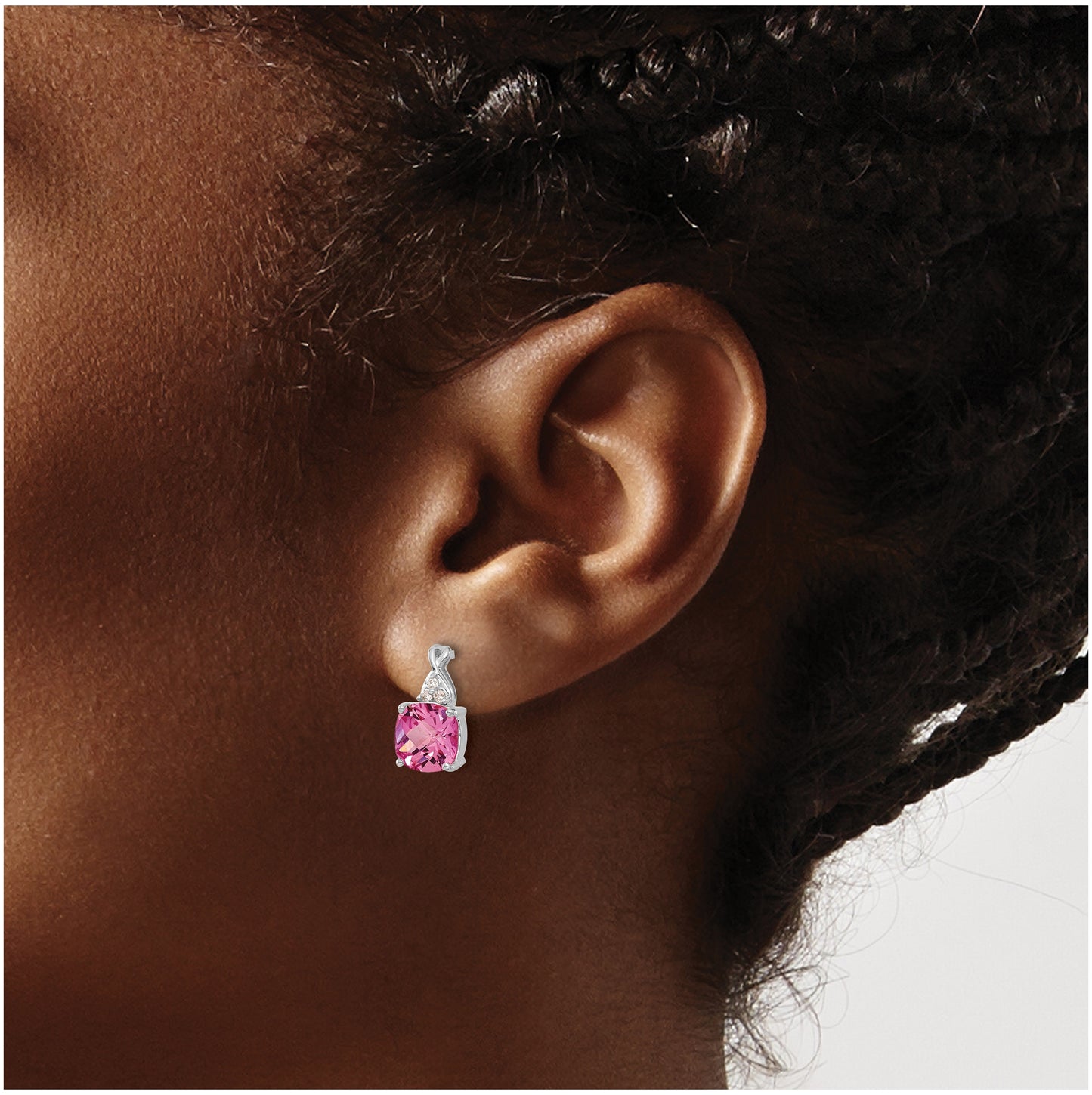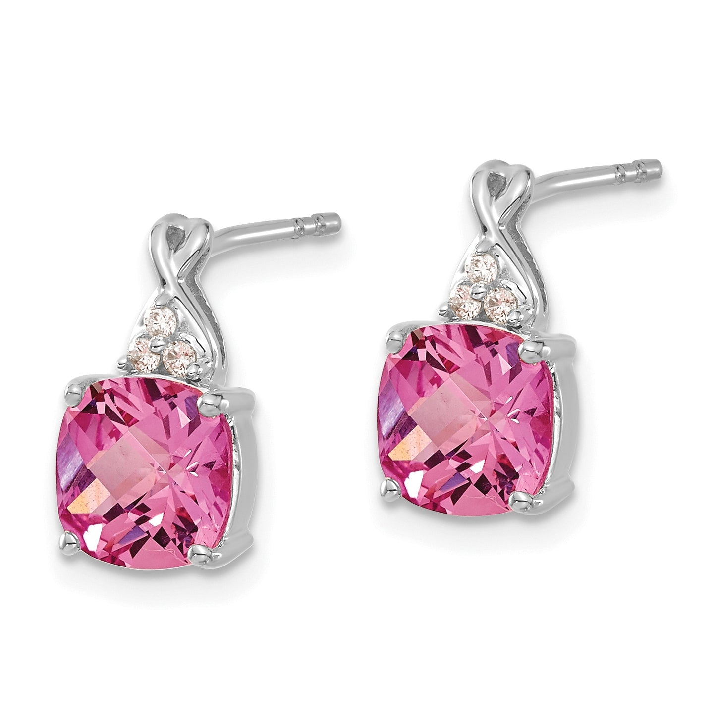 14K White Gold Checkerboard Created Pink Sapphire and Diamond Earrings