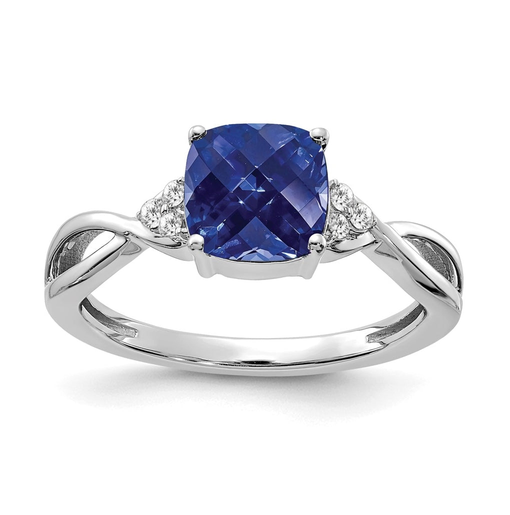 14K White Gold Checkerboard Created Sapphire and Diamond Ring, Size 7