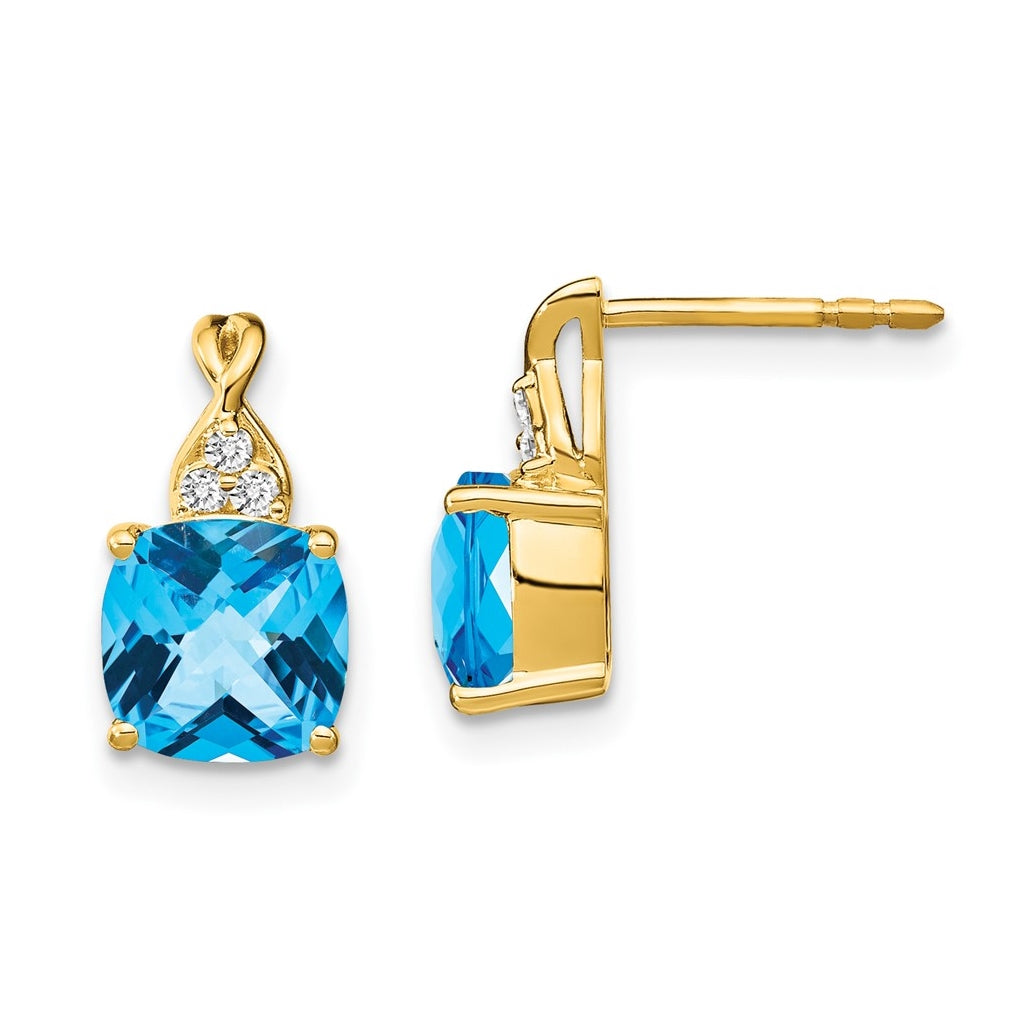14K Yellow Gold Checkerboard Blue Topaz and Diamond Earrings