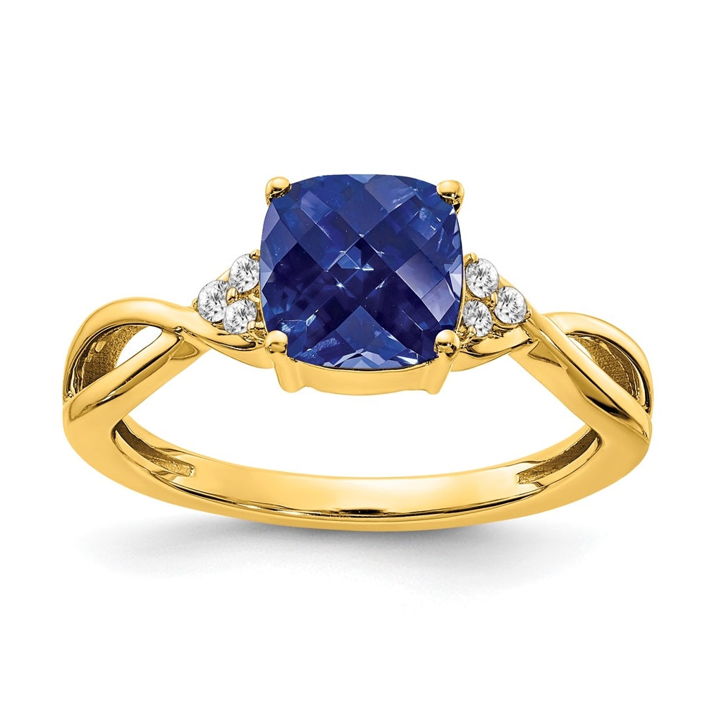 14K Yellow Gold Checkerboard Created Sapphire and Diamond Ring, Size 7
