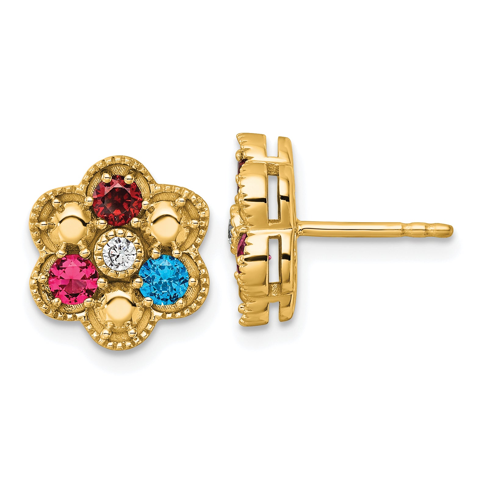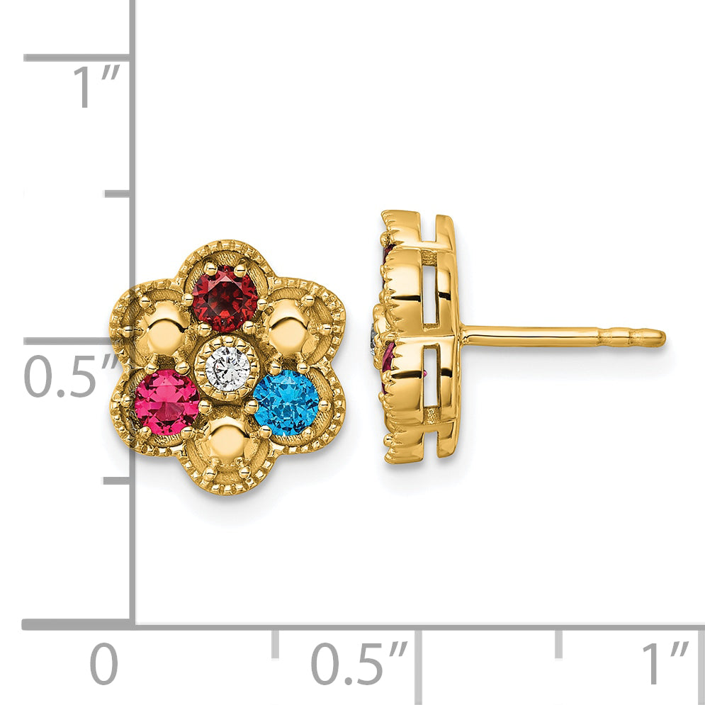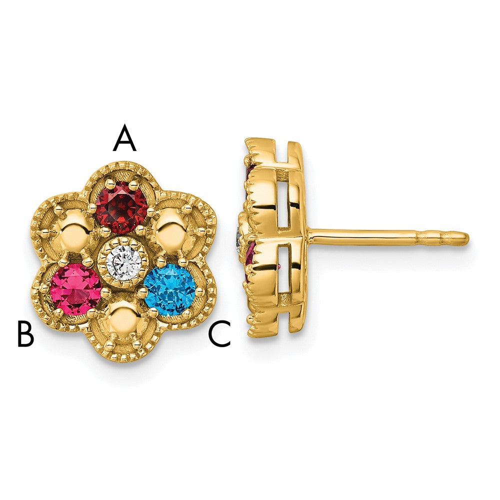 14K Yellow Gold Diamond Flower 3 Synthetic Birthstone Complete Earrings