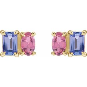 14K Yellow Gold Emerald 5 X 3 Mm Natural Tanzanite And Natural Pink Tourmaline Stud Earrings