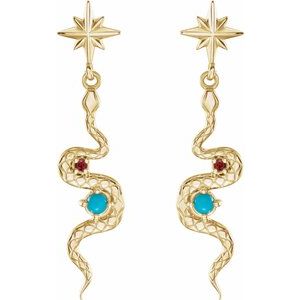 14K Yellow Gold Round 2 Mm Natural Turquoise And Natural Ruby Snake Dangle Earrings