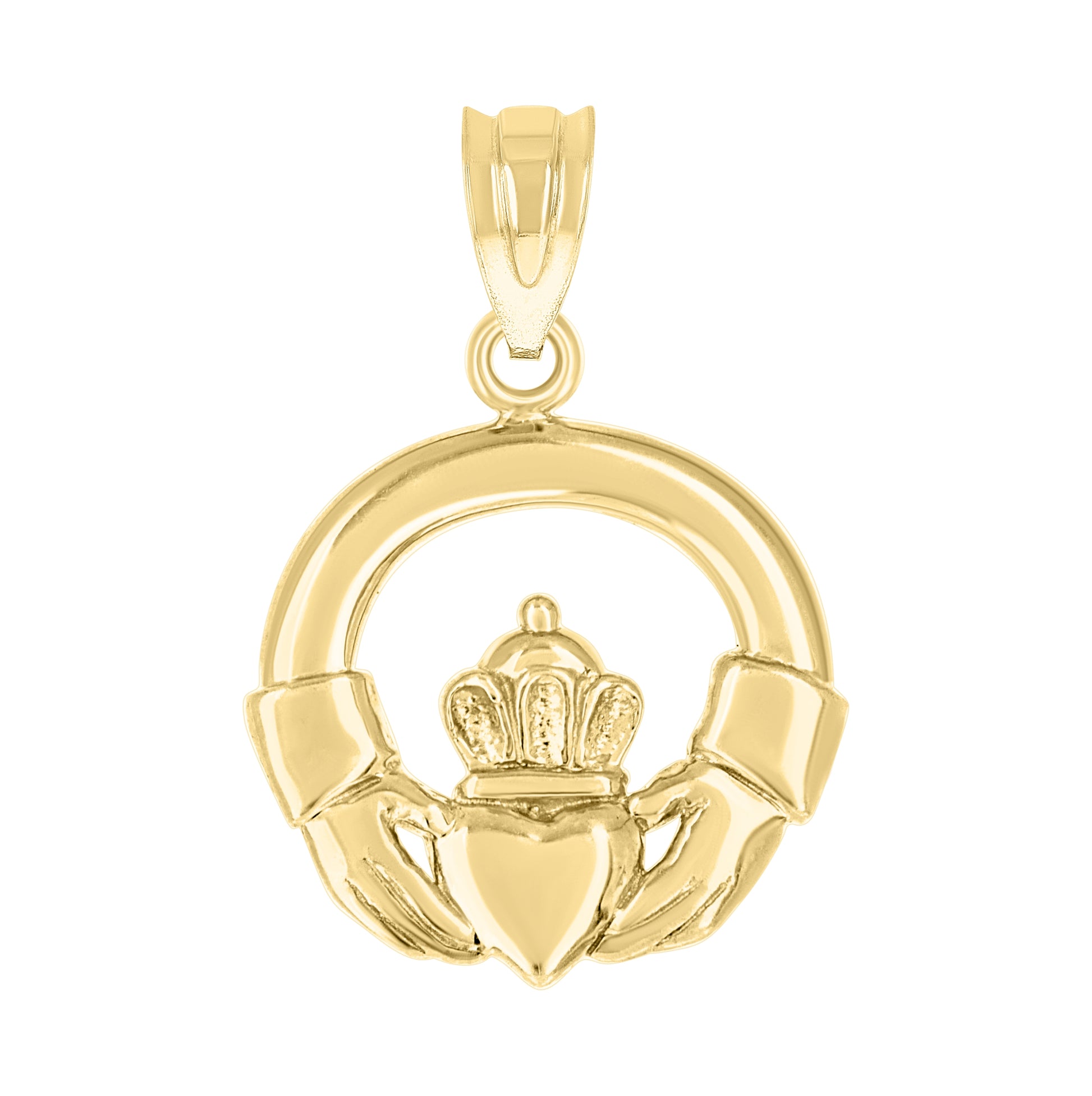 14K Yellow Gold Unisex Diamond-Cut Circle Heart Crown Hands Claddagh Ht:19.4Mm Good Luck Pendant Charm