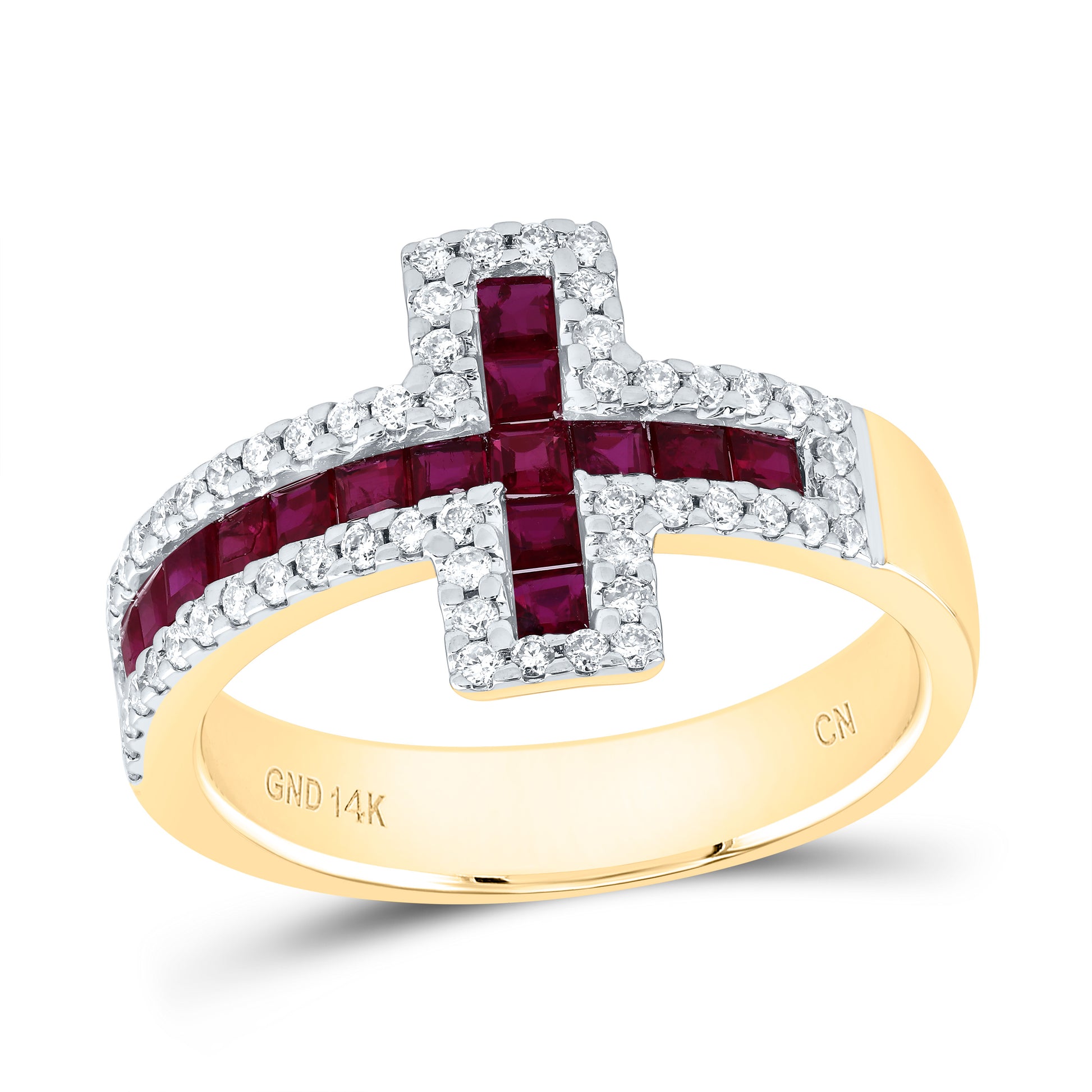 14kt Yellow Gold 1/3 Cttw Natural Diamond 3/4 Cttw- Pr Ruby Natural Gem Wedding Engagement Anniversary Cross Ring, Women Size: 5-9