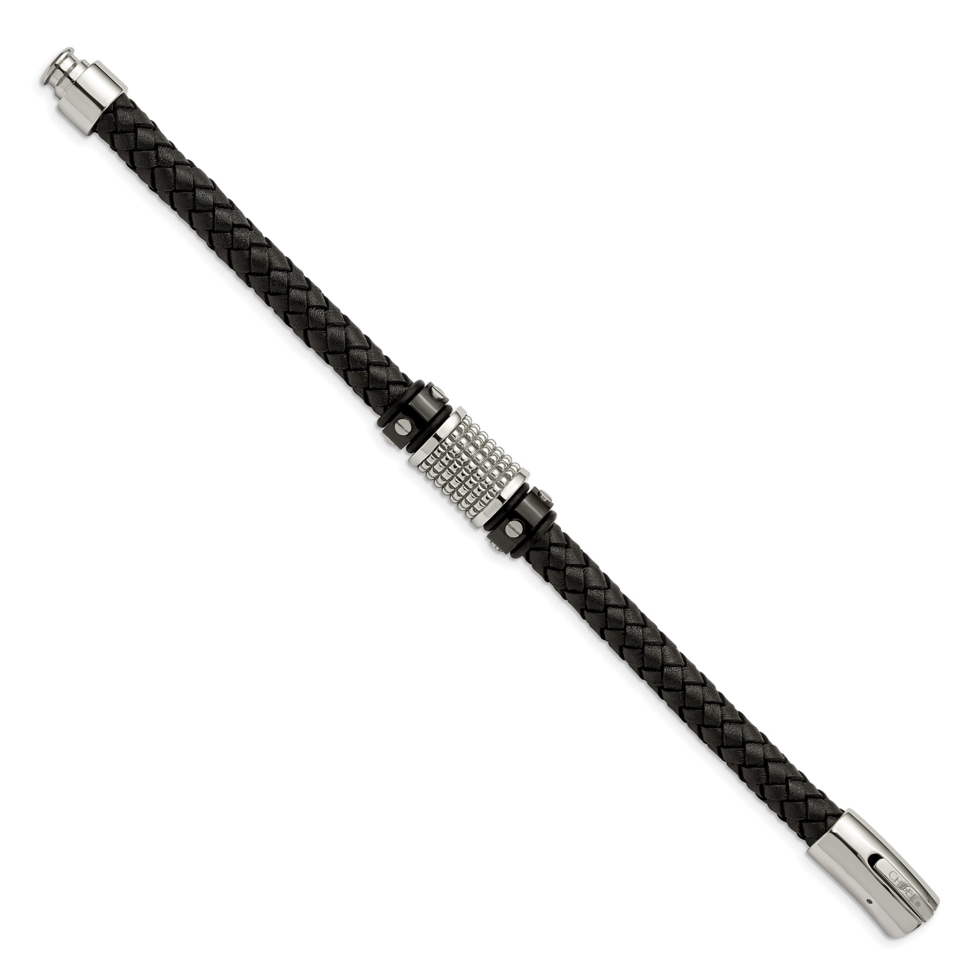 Chisel Stainless Steel Polished and Textured Black IP-plated Black Braided Leather and Rubber 8.5 inch Bracelet