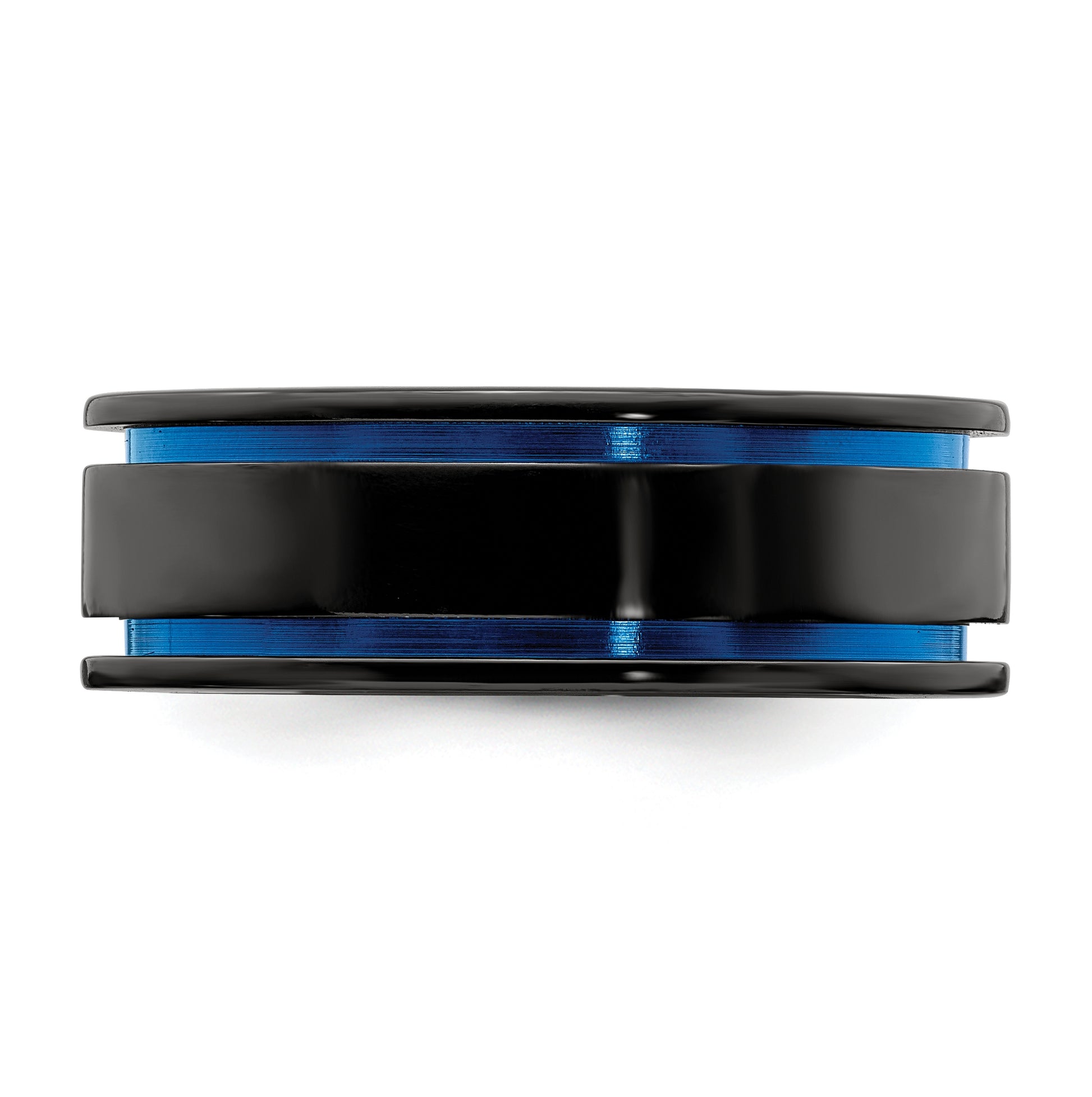 Edward Mirell Titanium Black Titanium with Blue Anodized Grooves Flat 8mm Band, Size 8.5
