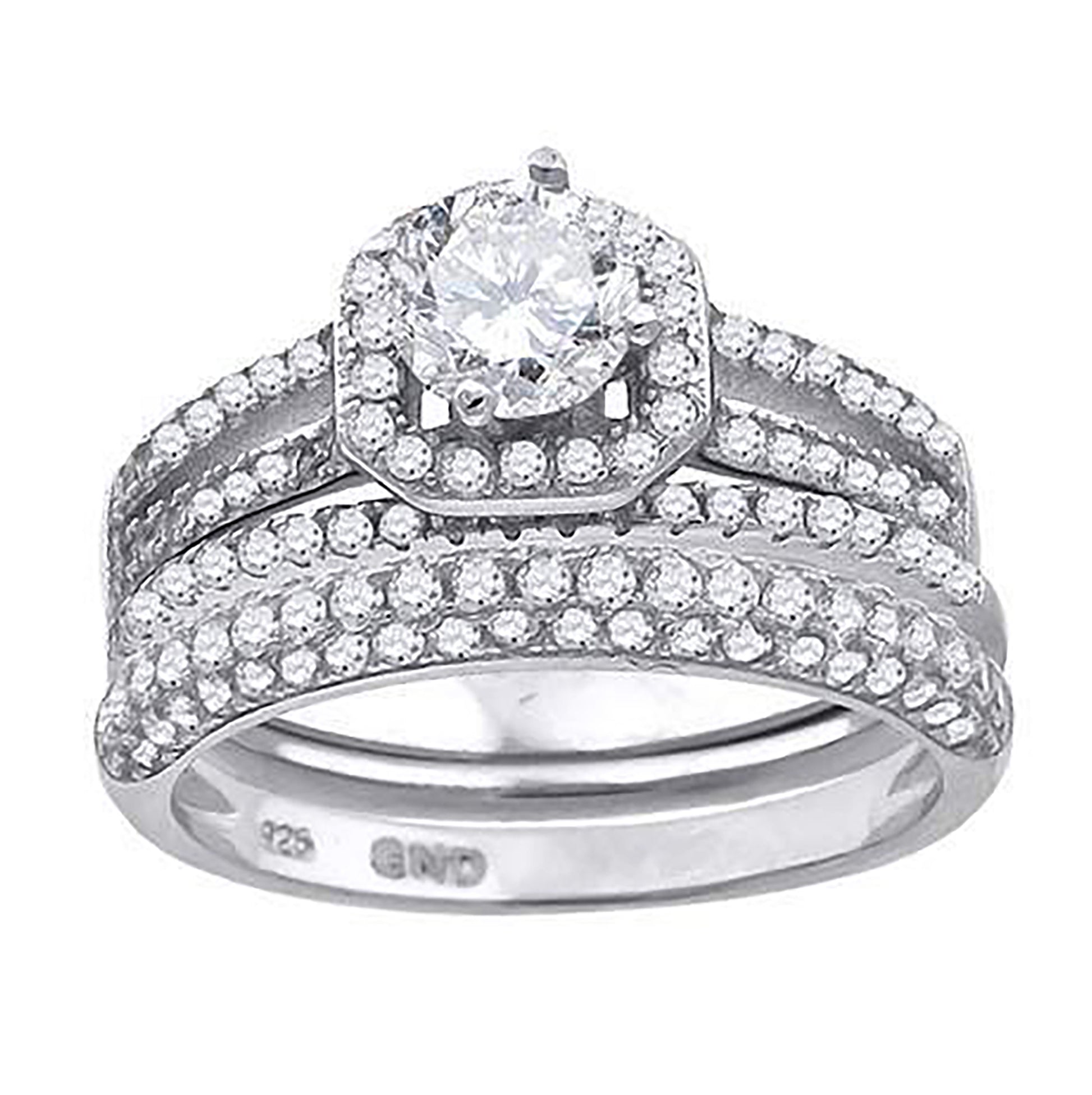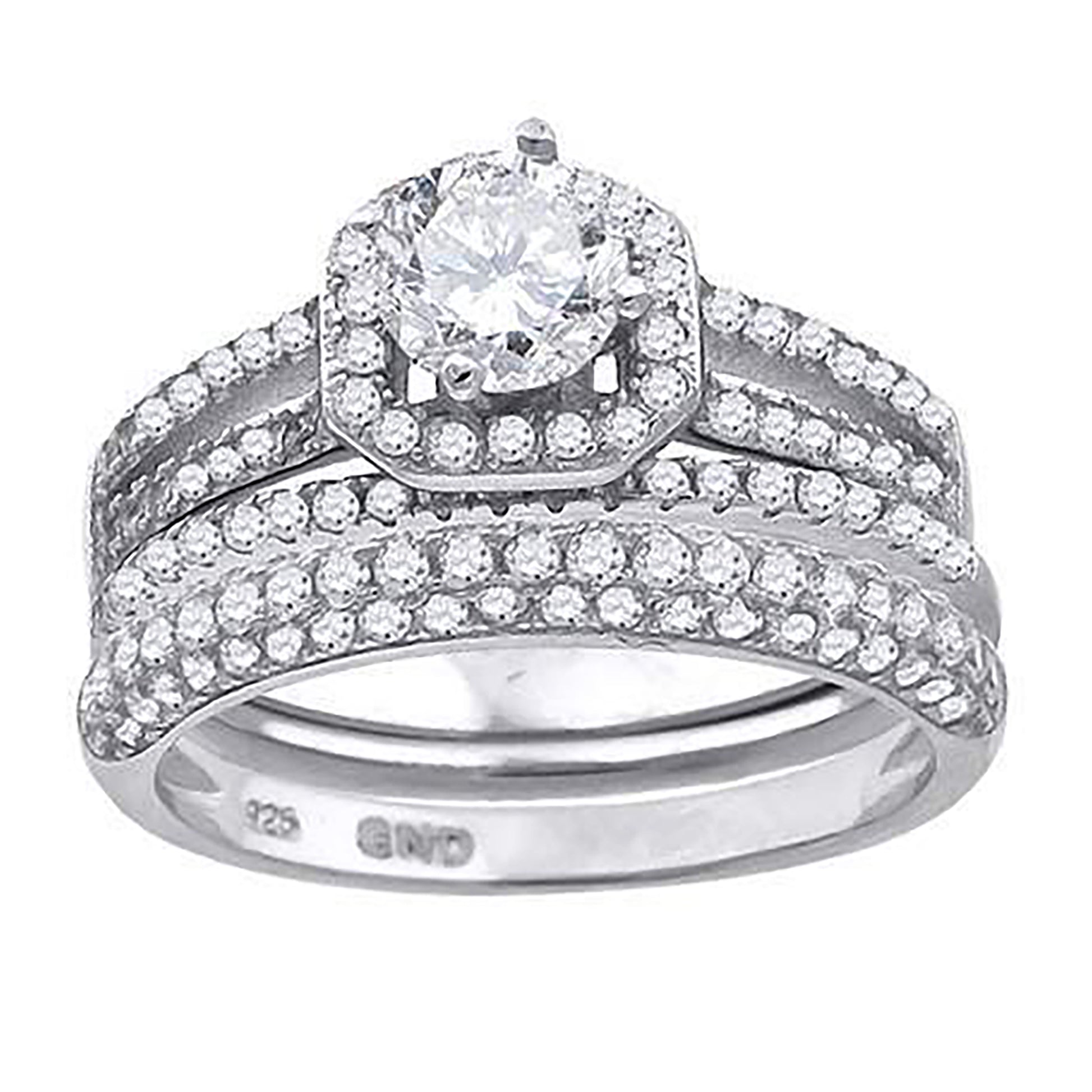 Sterling Silver Cubic Zirconia Halo Bridal Anniversary Engagement Wedding Trio Set Ring