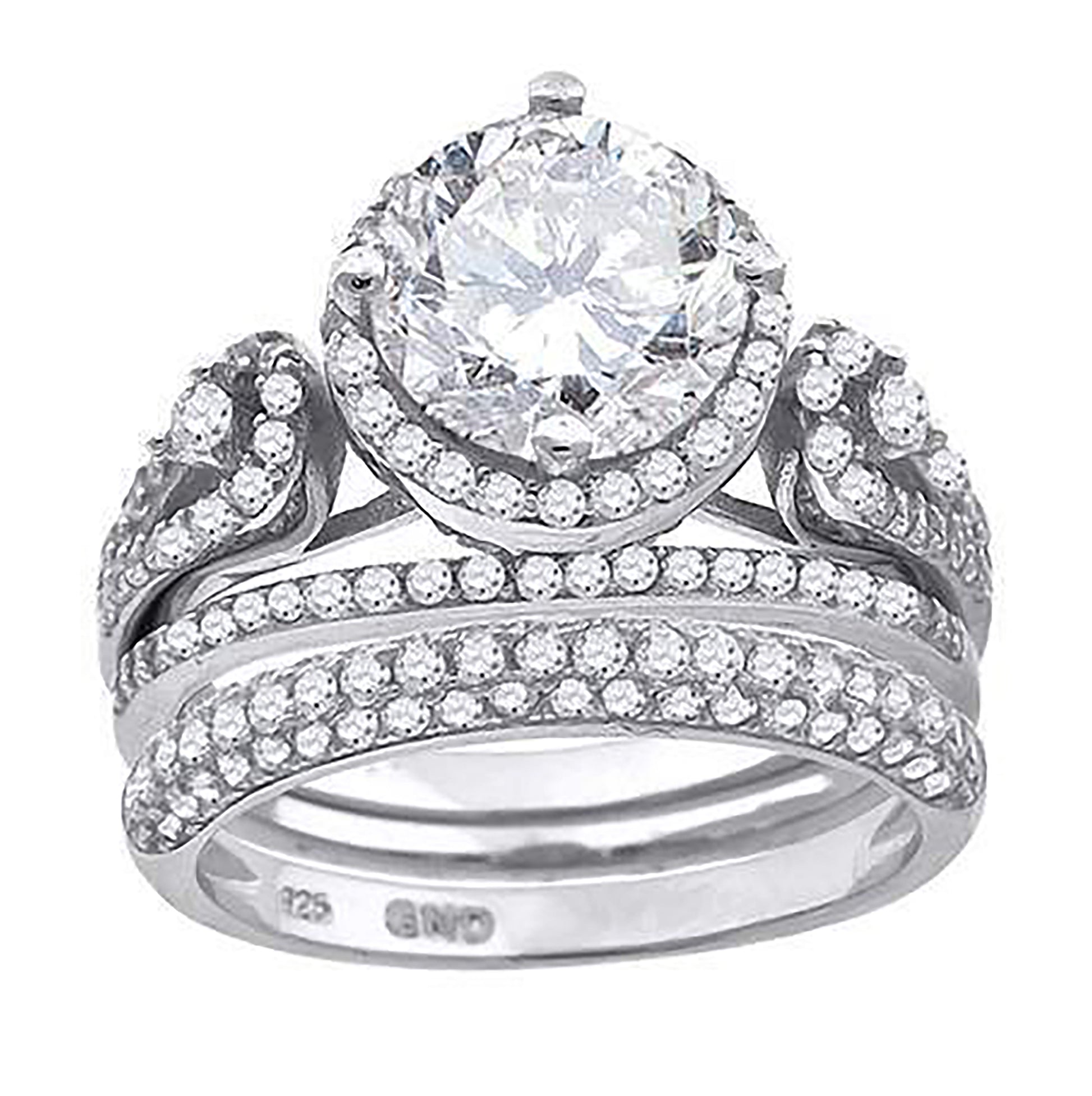 Sterling Silver Cubic Zirconia Halo Bridal Anniversary Engagement Wedding Trio Set Ring