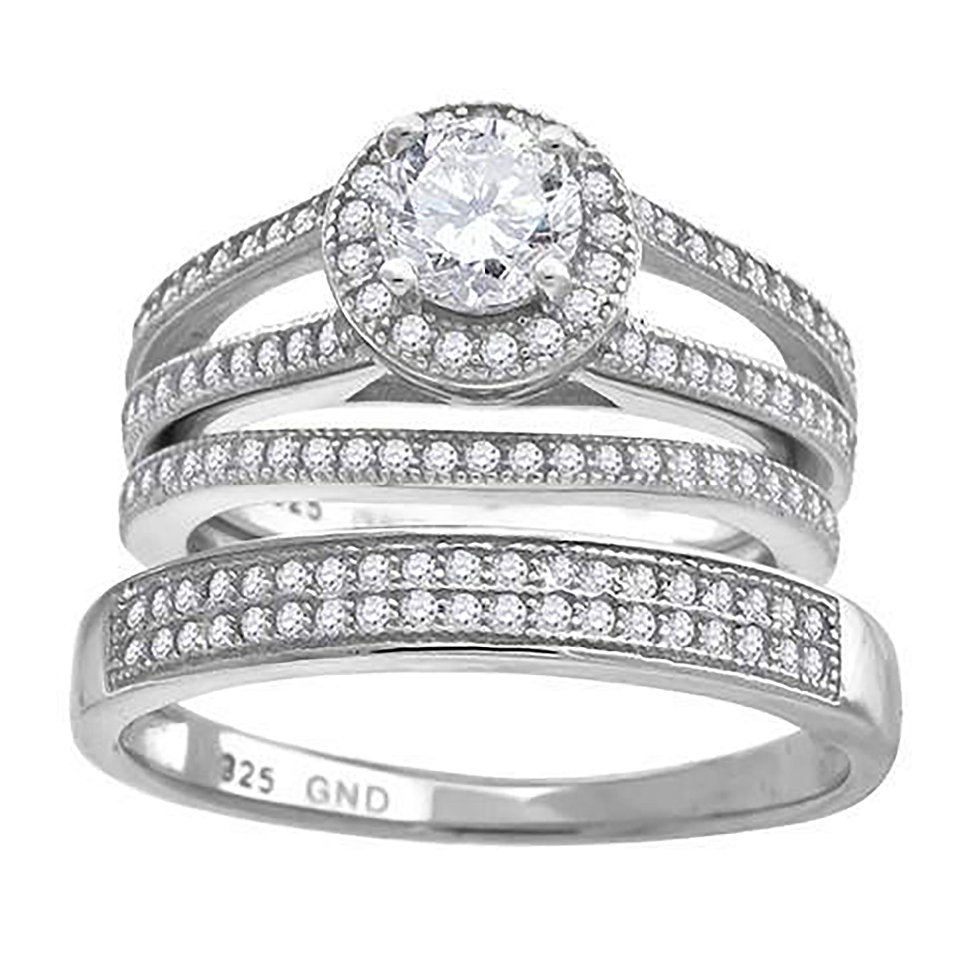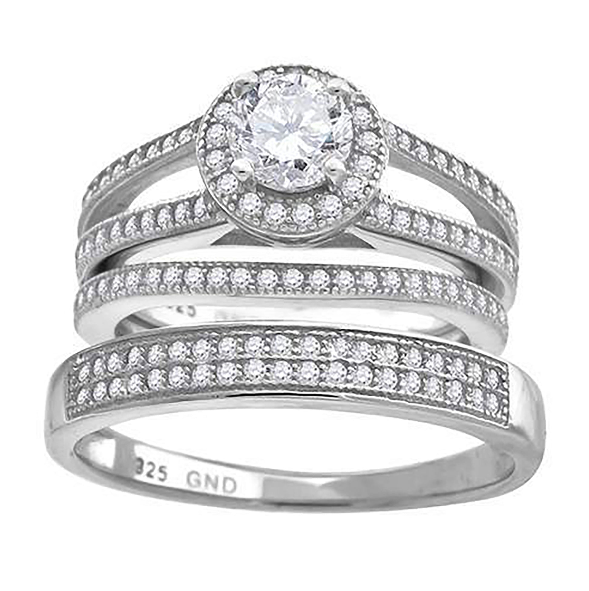 Sterling Silver Cubic Zirconia Halo Trio Bridal Anniversary Wedding Engagement Band Ring Set