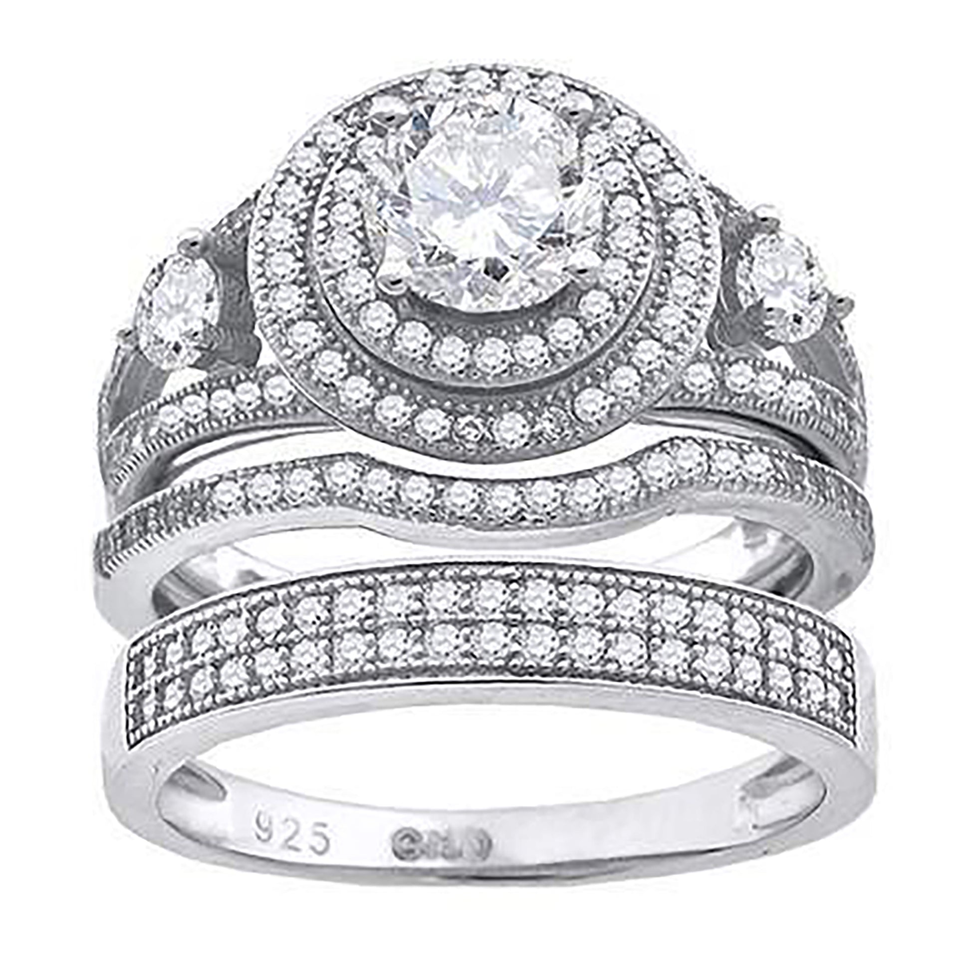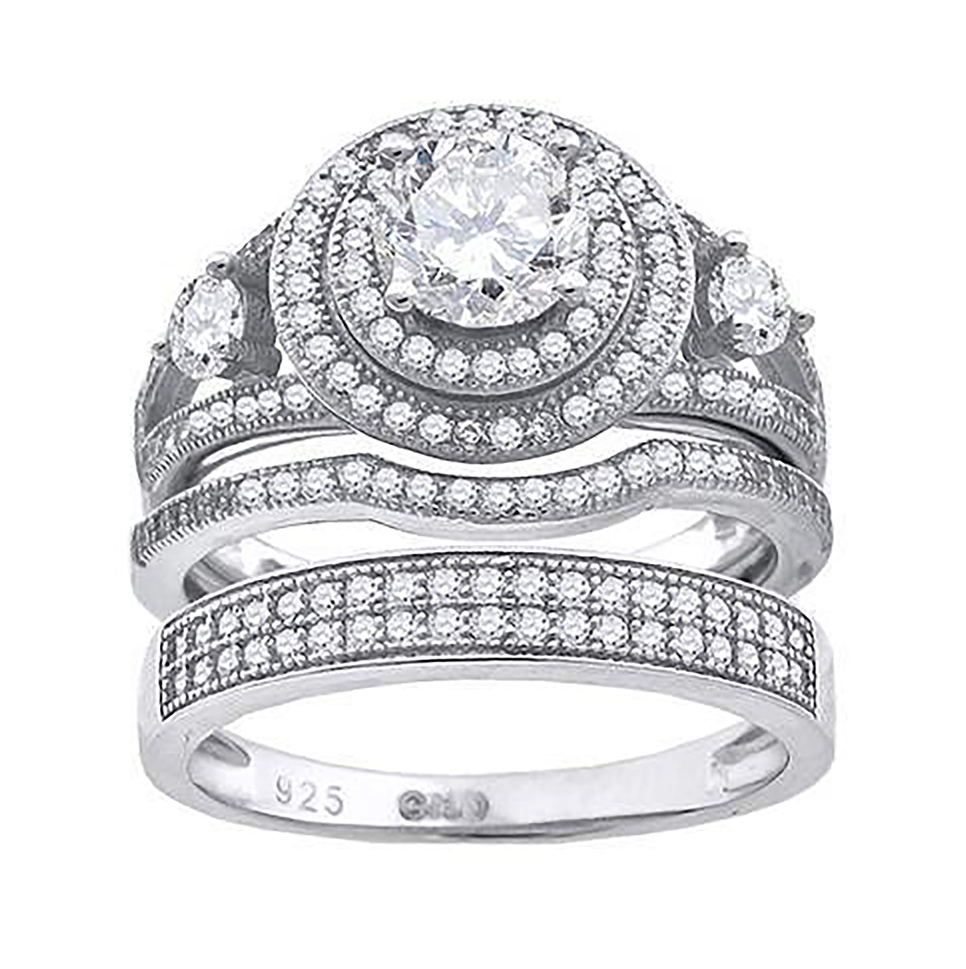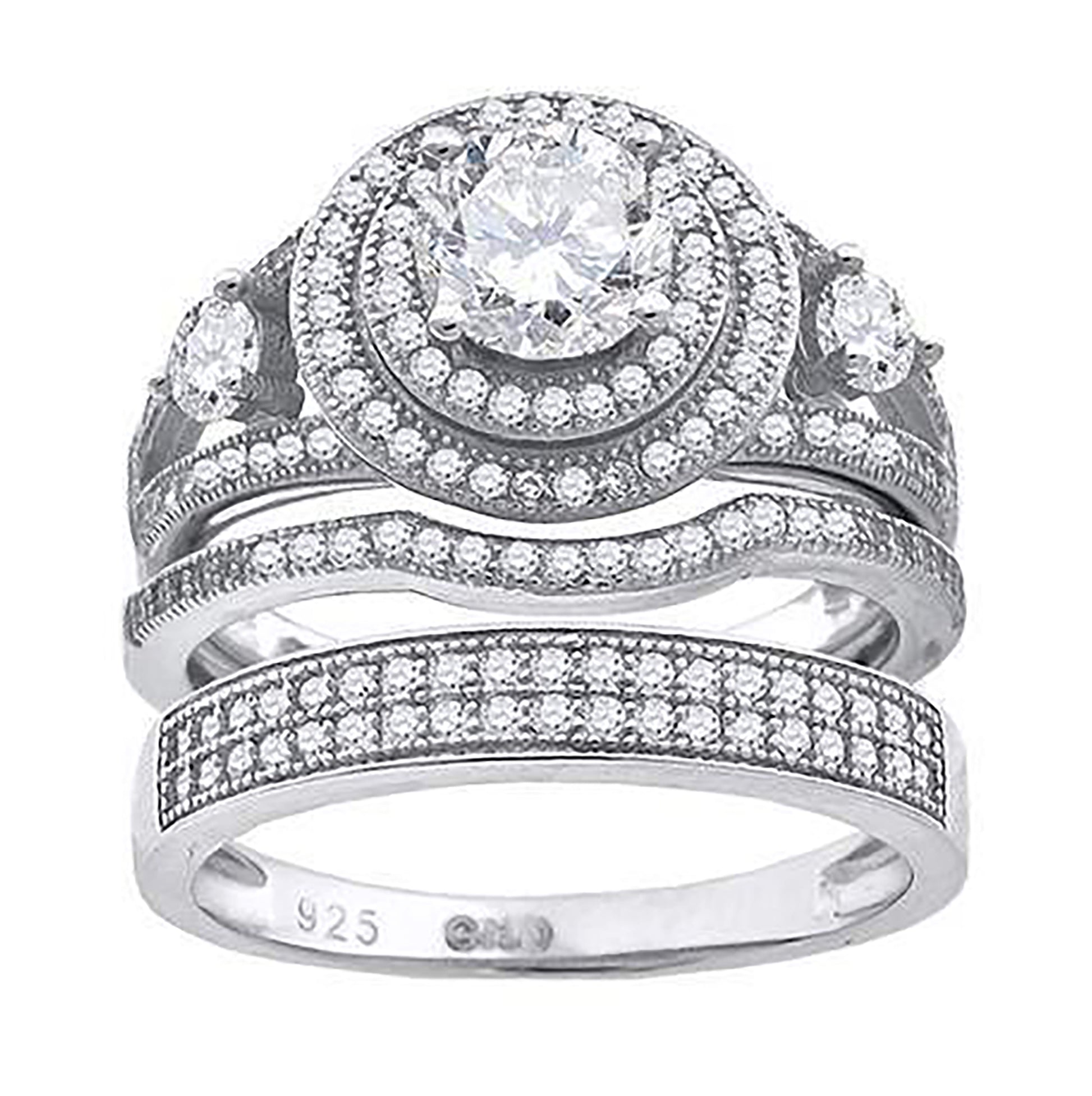 Sterling Silver Cubic Zirconia Trio Bridal Anniversary Wedding Engagement Band Ring Set