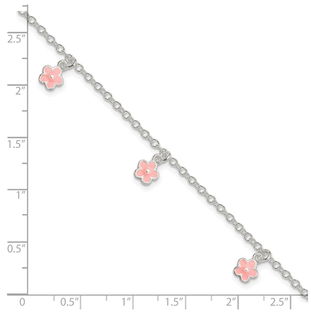 Sterling Silver Polished Pink Enamel Flowers w/1.5in Ext Children's Bracelet