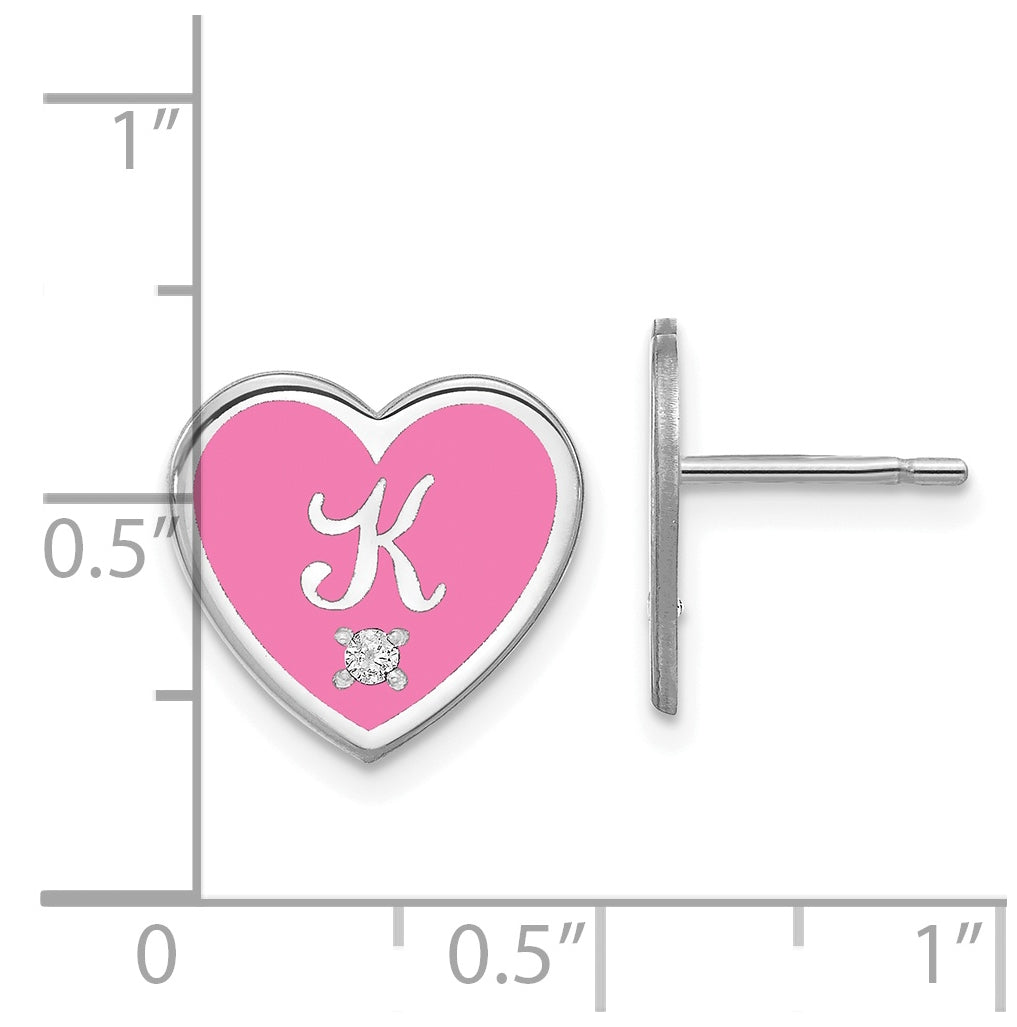 Sterling Silver Rhodium plated Initial Enameled Heart with Diamond Post Earrings