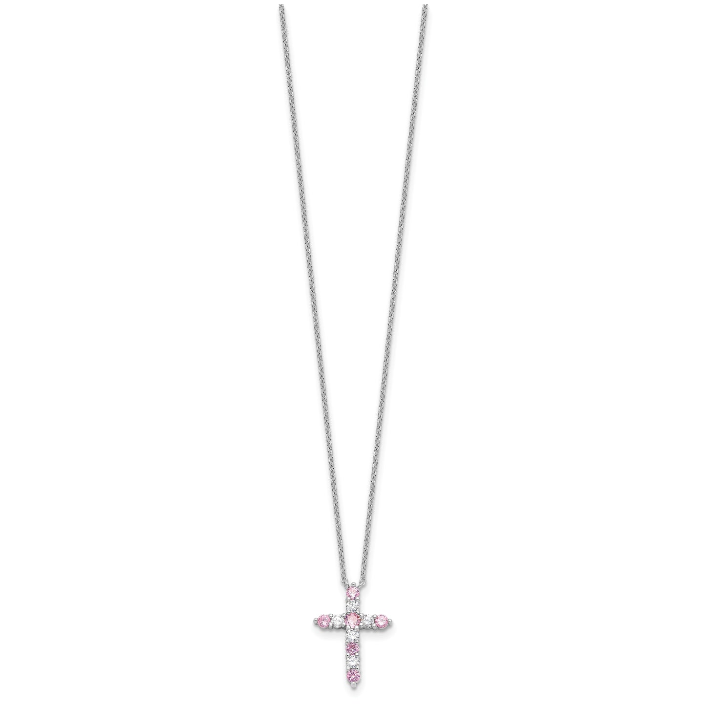 Sterling Silver Rhodium Plated Pink Cubic Zirconia October Birthstone Cross with 2in ext Necklace