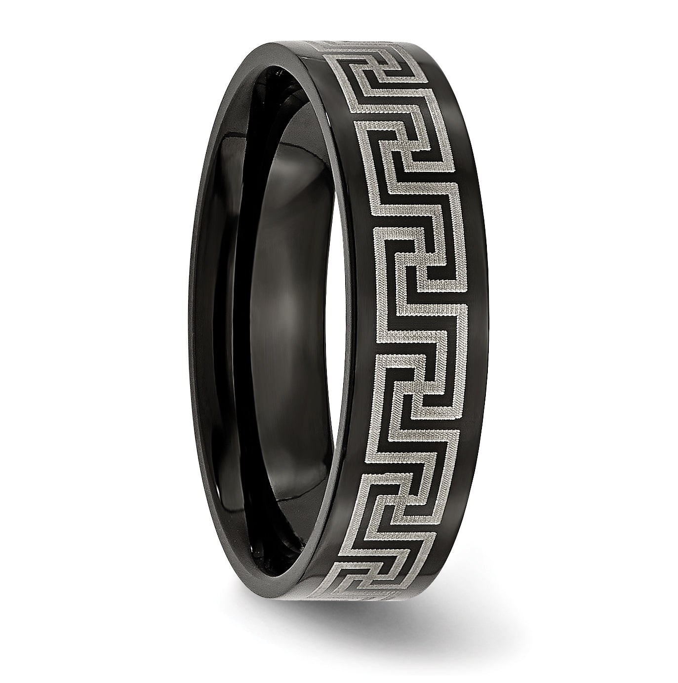 Titanium Brushed Polished Black IP Laser Etched Greek Key 6mm Band, Size 13